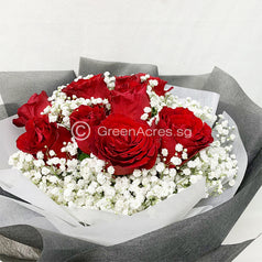 Always On My Mind 11 stalk Rose with baby’s breath. Greenacres reserves the right to replace any item with another of equivalent value depending...